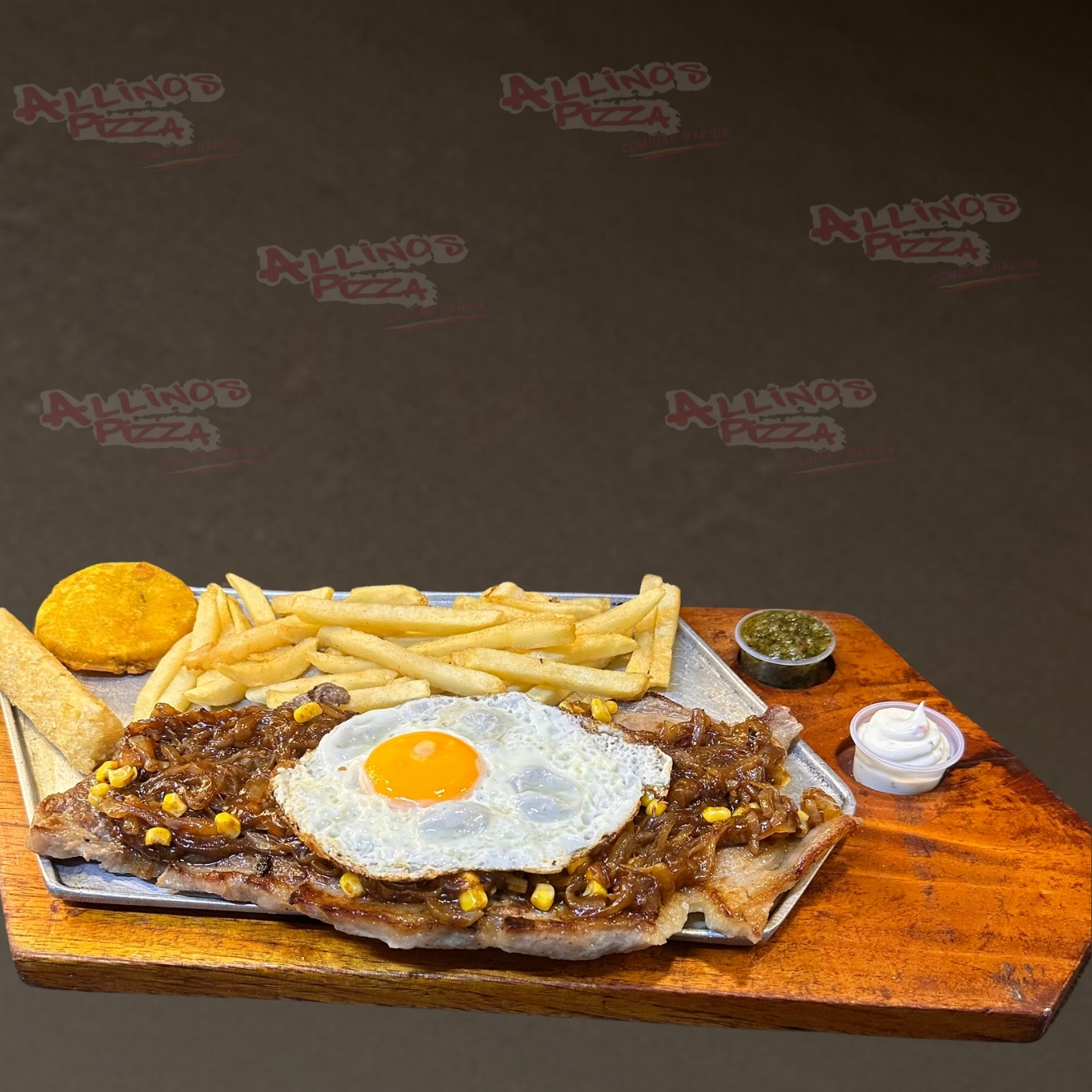 Complemento: Arroz, ensalada, papas a la francesa o papa criolla, yuca, patacón.