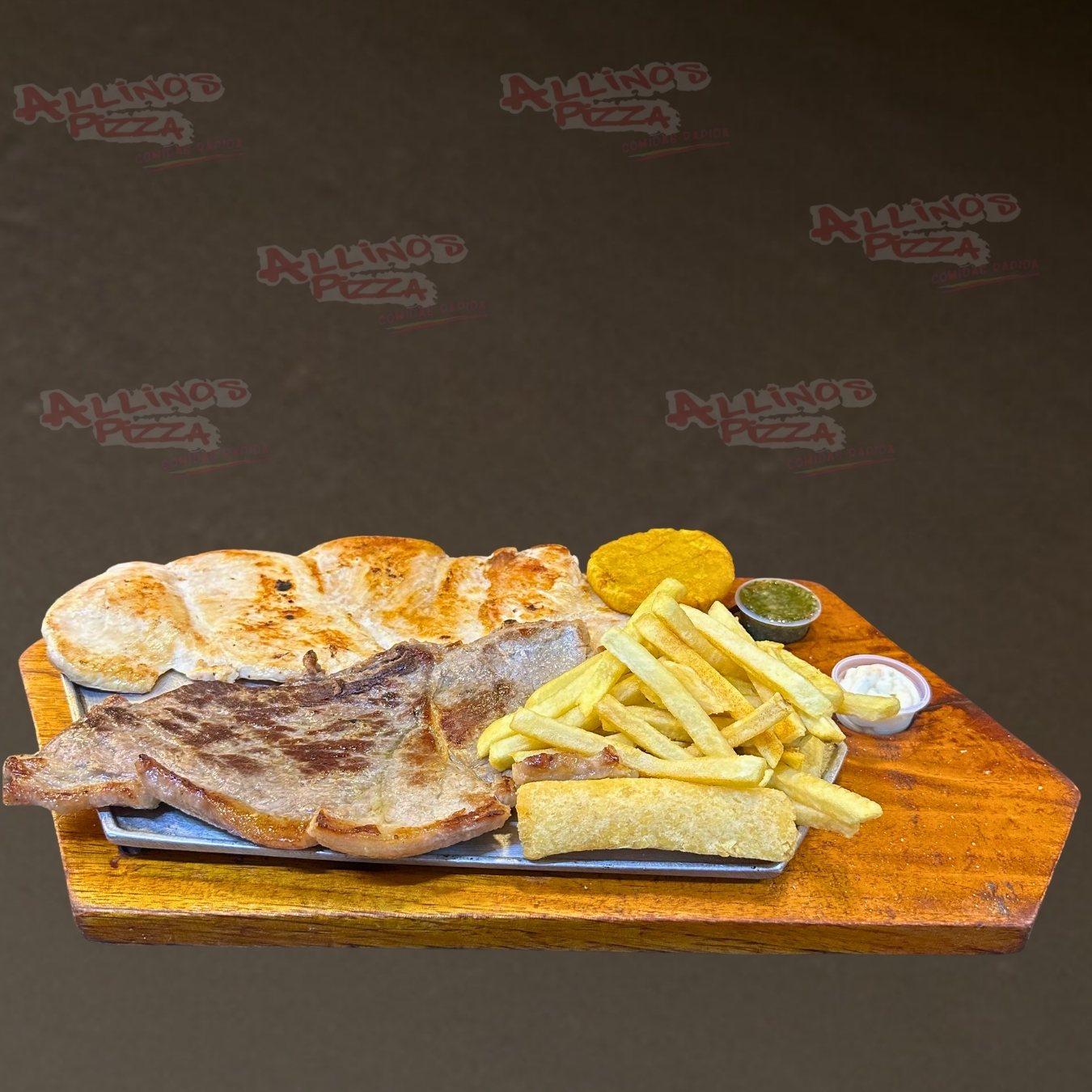 Carne, Fríjol, Guacamole. Chicharrón, Pico de Gallo, Queso, Arroz, Ensalada, Papas a la Francesa o Papa Criolla.