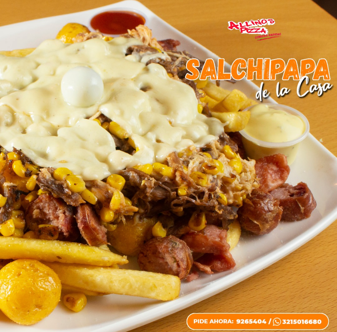 Papa francesa, papa criolla, dos salchichas Zenú, queso, huevo de codorniz, pollo, carne, maiz tierno y chorizo.