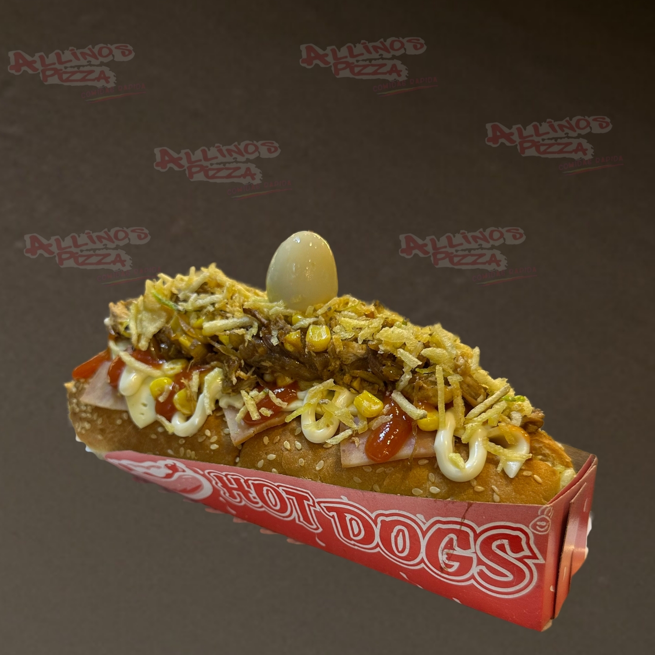 Salchicha Americana, jamón, maiz tierno, carne y pollo desmechado, papa chips, queso y huevo de codorniz.