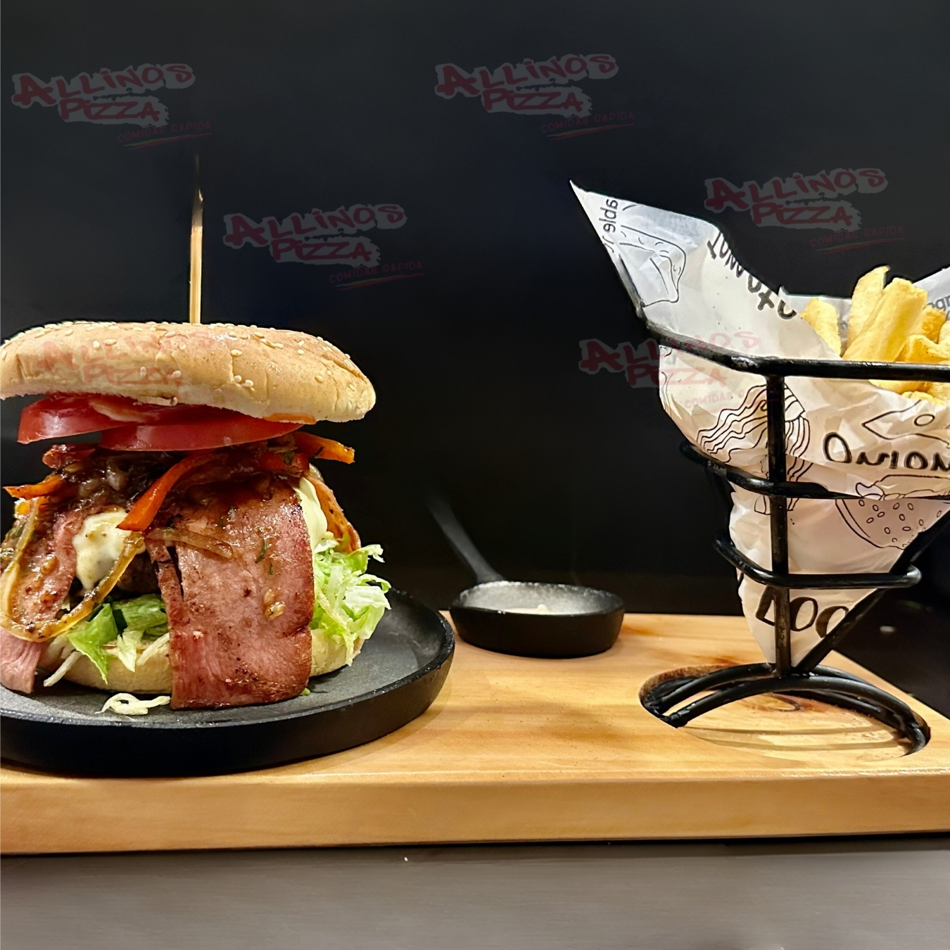 Doble carne de res, tocineta, queso, huevo de codorniz, ensalada, ají, pimentón, papa chips y salsa.