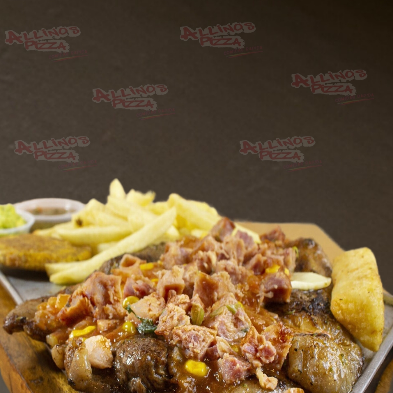 ´Pollo y carne desmechada, champiñones, queso, huevo de codorniz y salsas.