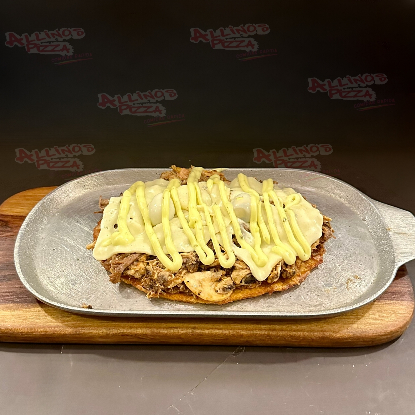 Carne desmechada, queso, huevo de codorniz y salsas.