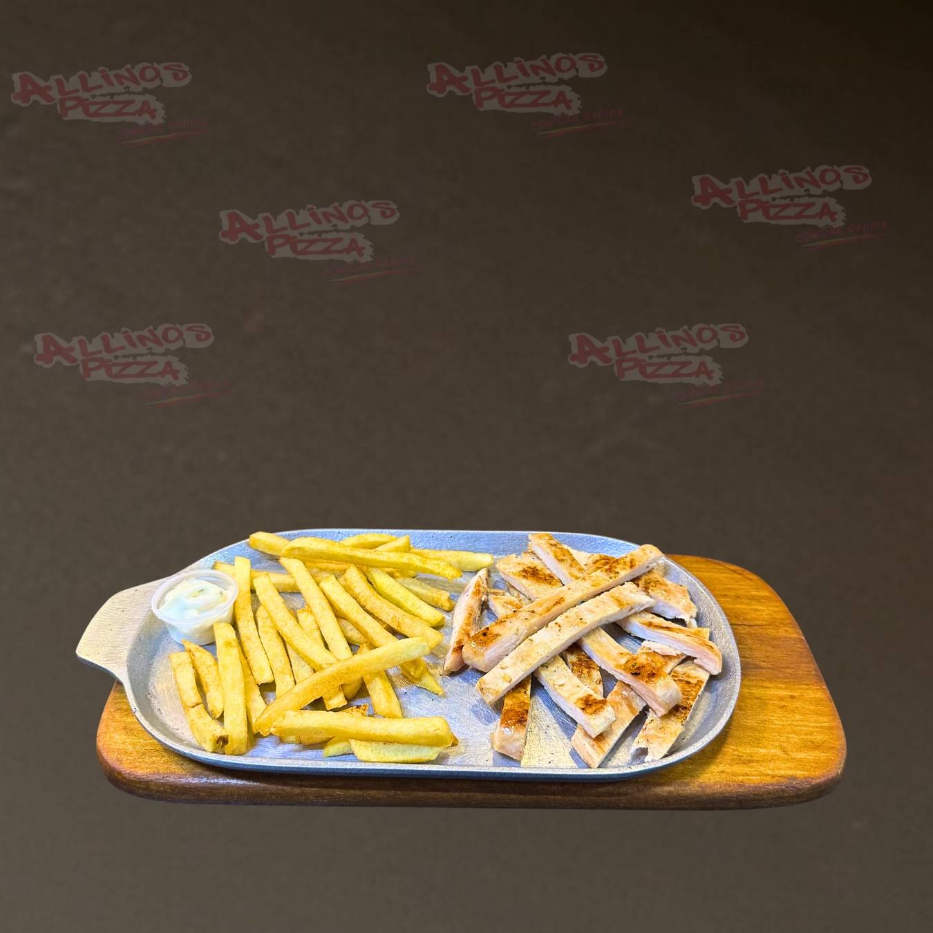 Pechuga asada en trozos, papa francesa y jugo Hit en cajita
