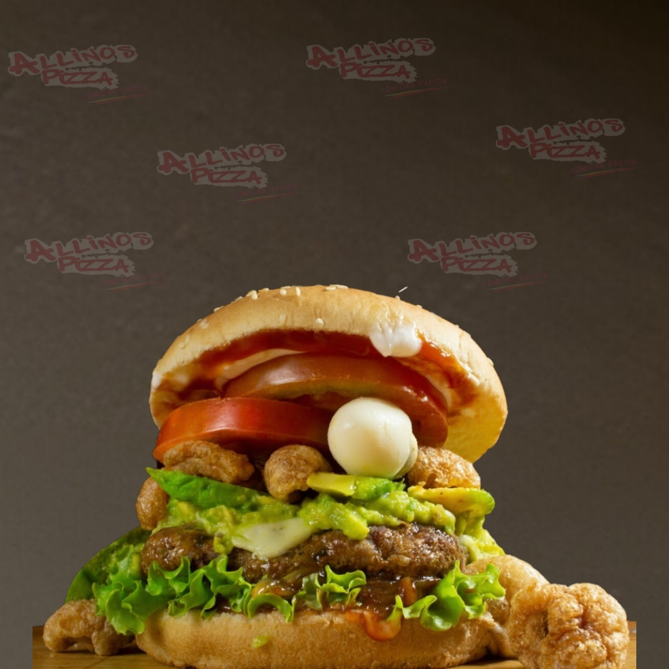 Carne de cerdo apanado, aguacate, doble queso, tocineta, ensalada, huevos de codorniz, guacamole y chicarrón