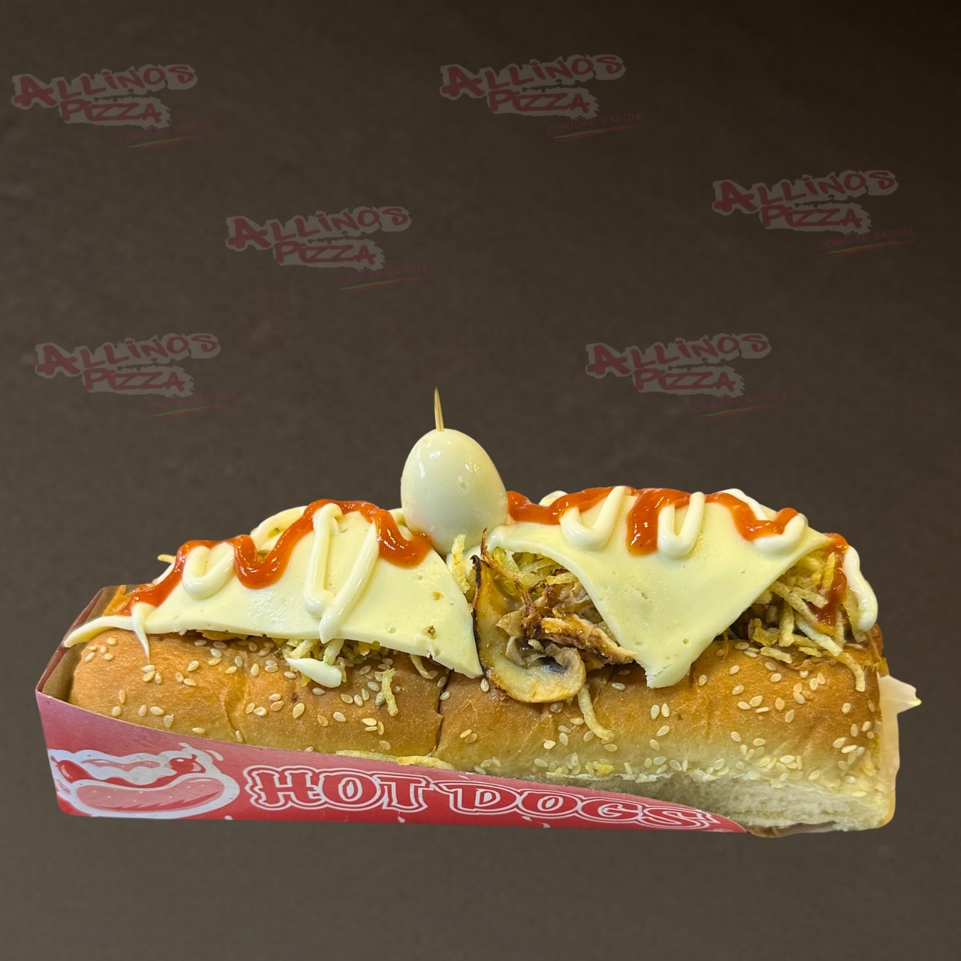 Salchicha tipo Americana, papa chips, cebolla, pollo, champiñones, huevo de codorniz y queso.